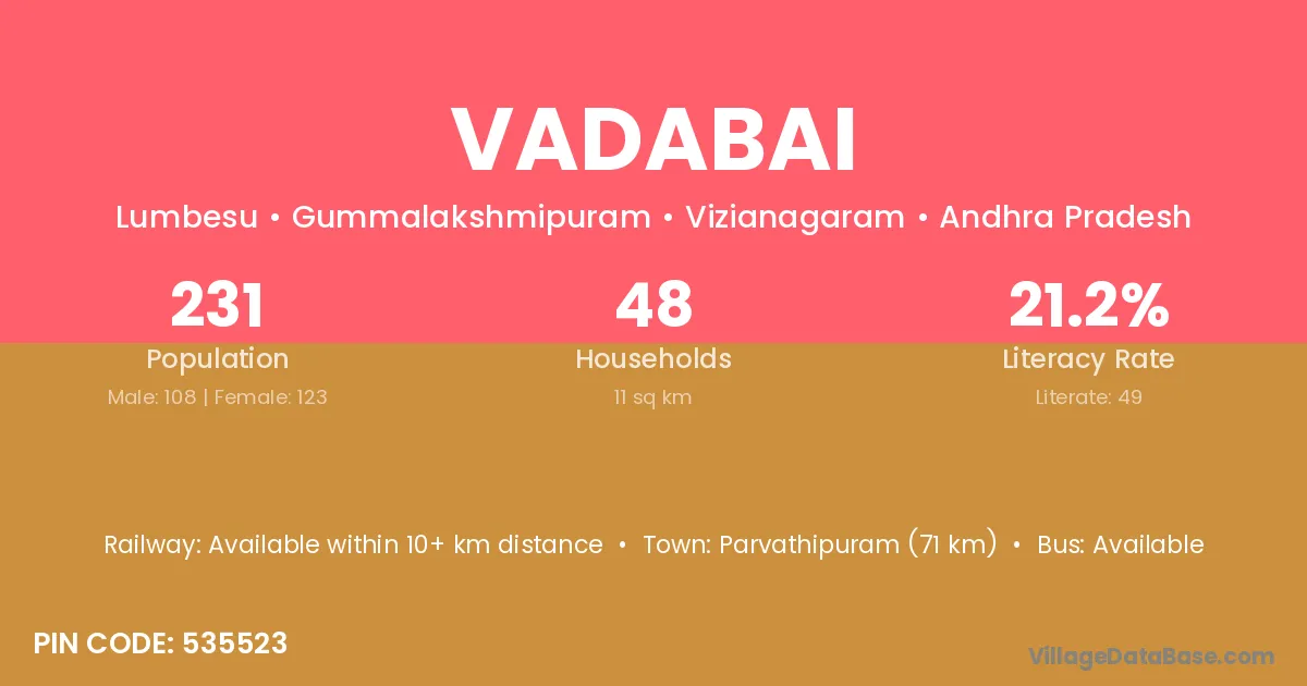 Vadabai village has a total population of 231 people, of which 108 are males and 123 are females.