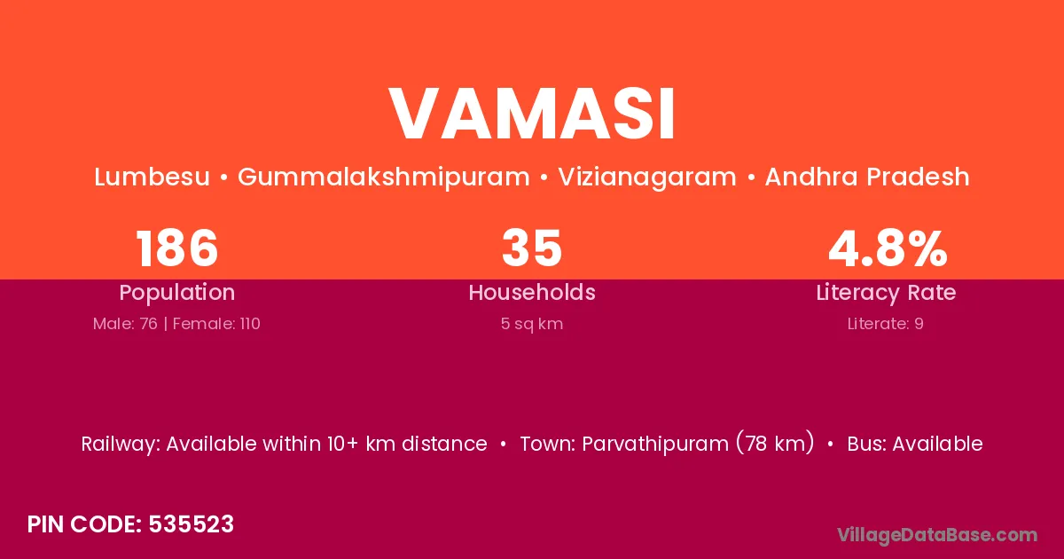 Parvathipuram (78 km) is the nearest town to Vamasi village for major economic activities and is located approximately 78 km away.