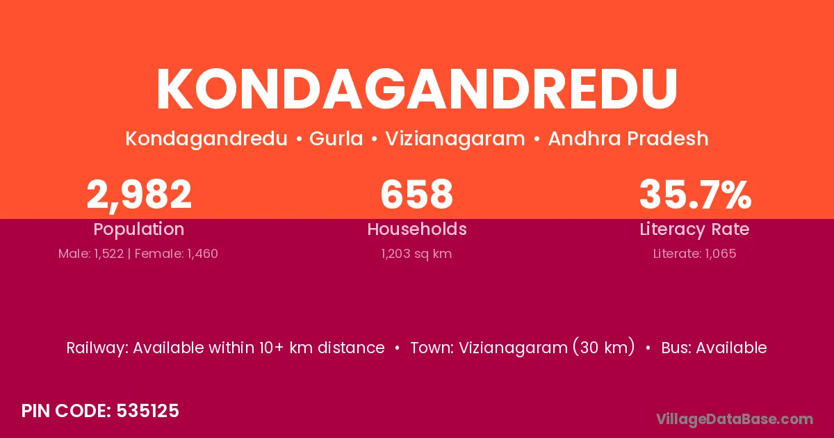 Vizianagaram (30 km) is the nearest town to Kondagandredu village for major economic activities and is located approximately 30 km away.