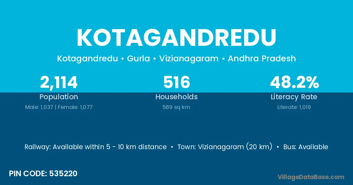 Vizianagaram (20 km) is the nearest town to Kotagandredu village for major economic activities and is located approximately 20 km away.