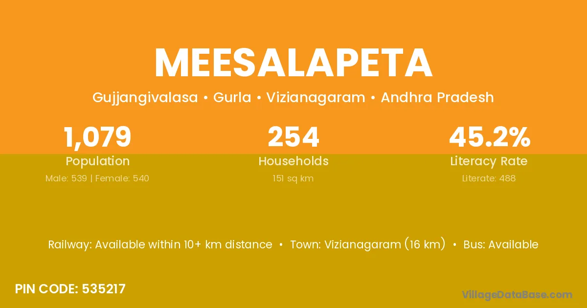 Meesalapeta village has a total population of 1,079 people, of which 539 are males and 540 are females.