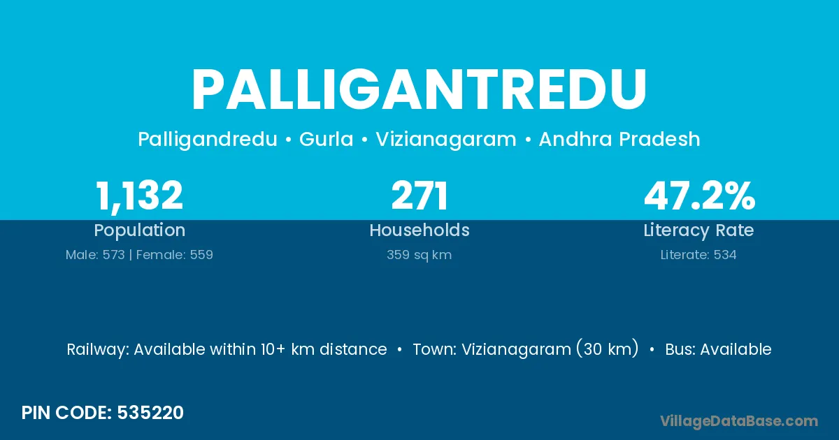Vizianagaram (30 km) is the nearest town to Palligantredu village for major economic activities and is located approximately 30 km away.