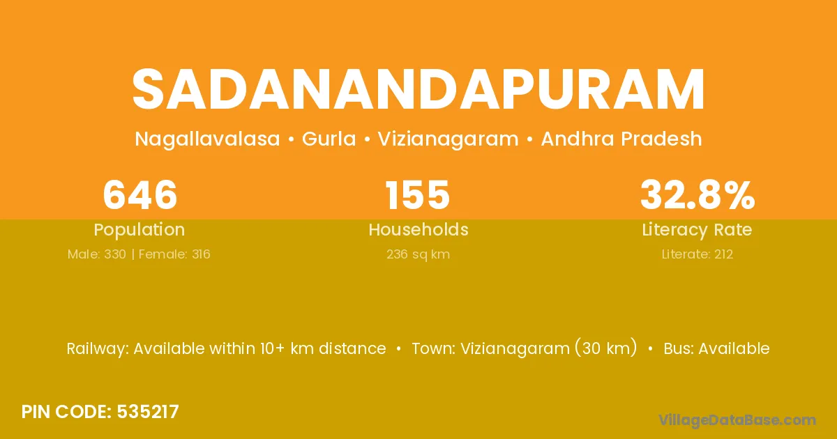 Vizianagaram (30 km) is the nearest town to Sadanandapuram village for major economic activities and is located approximately 30 km away.