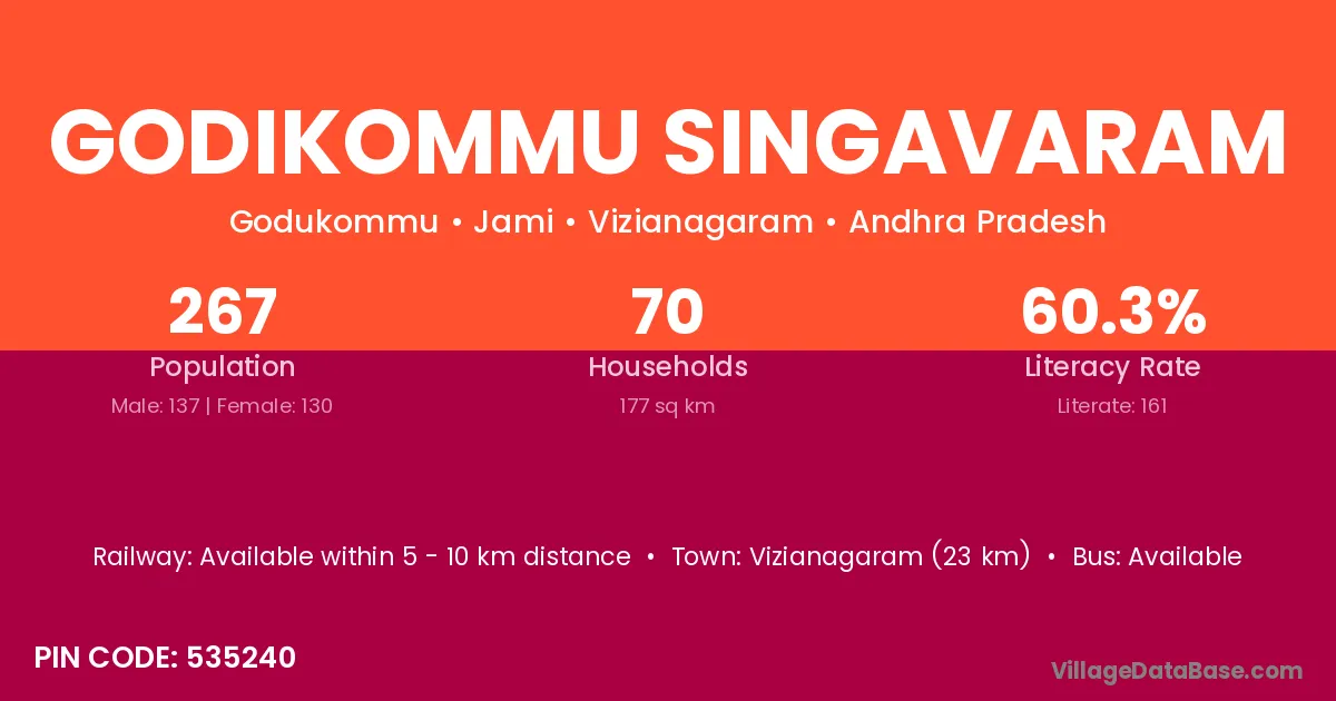 Vizianagaram (23 km) is the nearest town to Godikommu Singavaram village for major economic activities and is located approximately 23 km away.