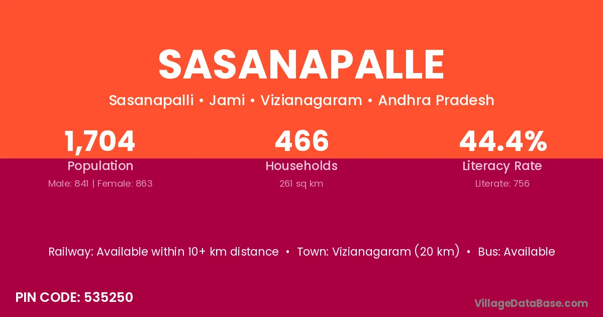 Vizianagaram (20 km) is the nearest town to Sasanapalle village for major economic activities and is located approximately 20 km away.