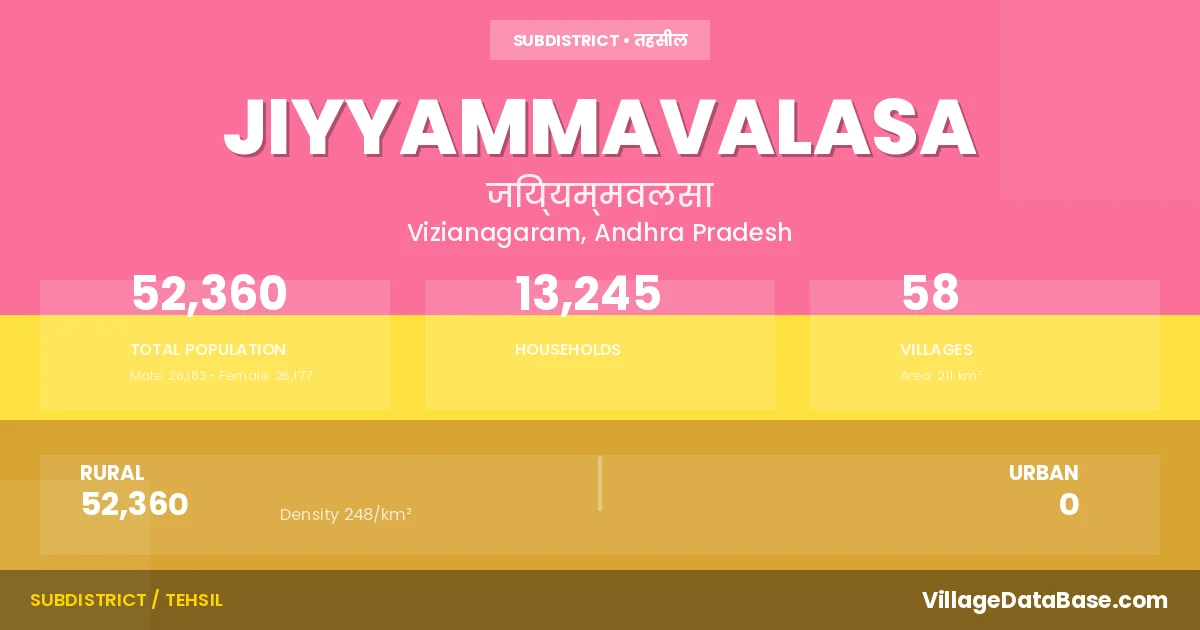 According to the 2011 census The total area of Jiyyammavalasa Mandal is 211 km², with a population of 52360 people. The population density is 248 inhabitants per square kilometre, and there are approximately 13245 houses in the sub district.