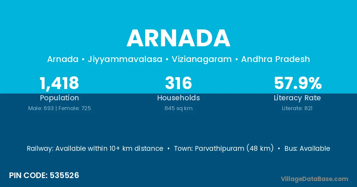Parvathipuram (48 km) is the nearest town to Arnada village for major economic activities and is located approximately 48 km away.