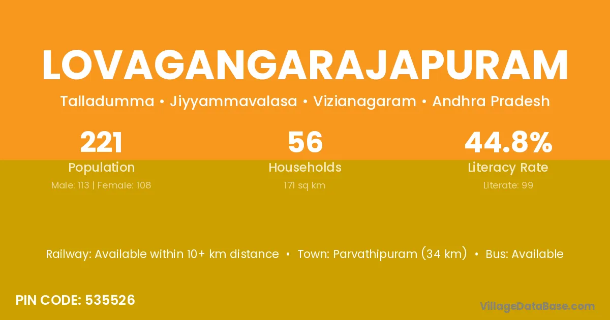 Parvathipuram (34 km) is the nearest town to Lovagangarajapuram village for major economic activities and is located approximately 34 km away.