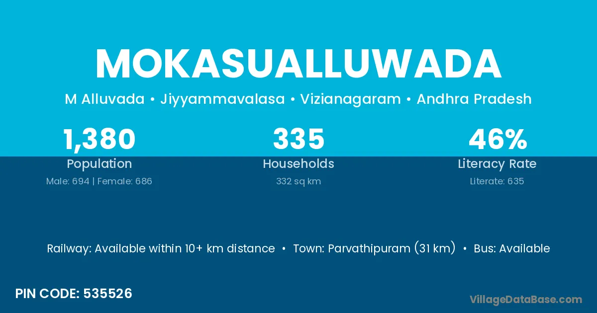 Parvathipuram (31 km) is the nearest town to Mokasualluwada village for major economic activities and is located approximately 31 km away.