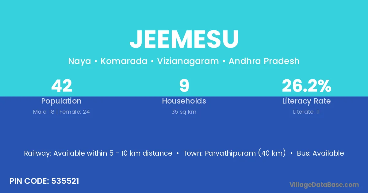 Parvathipuram (40 km) is the nearest town to Jeemesu village for major economic activities and is located approximately 40 km away.