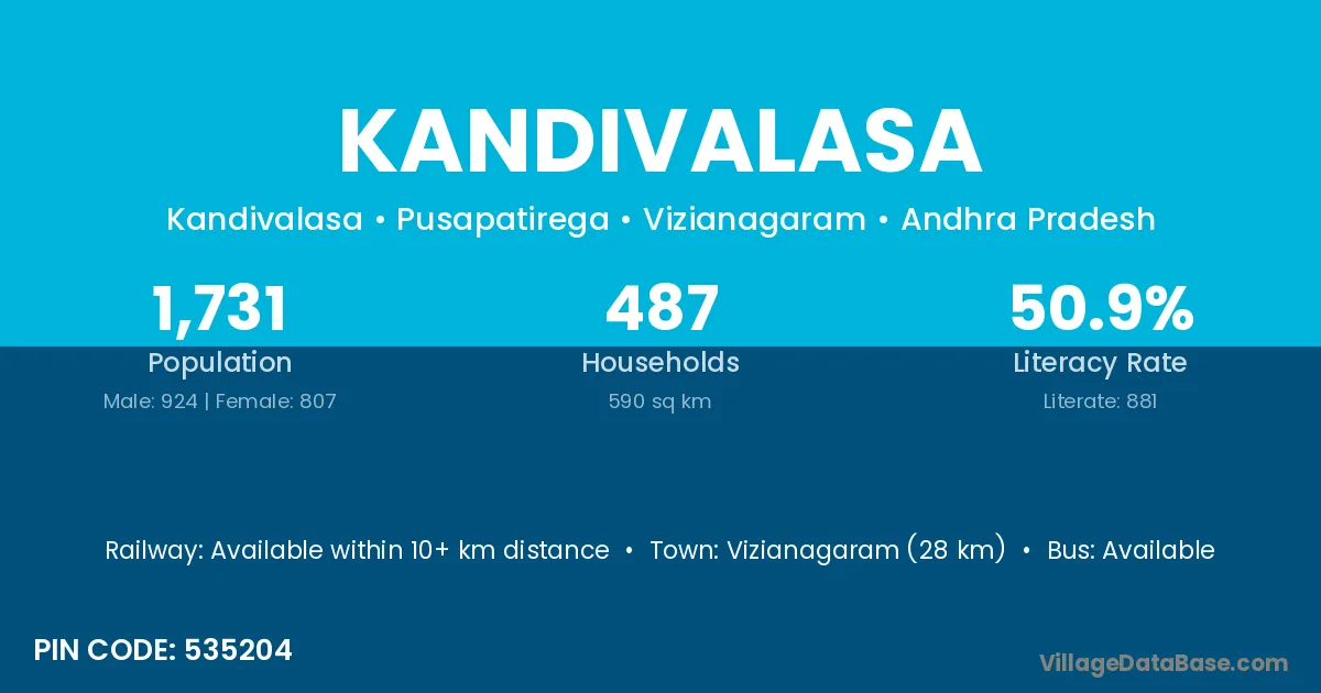 The literacy rate of Kandivalasa village is 55.81%. Male literacy stands at 65.42% and female literacy at 46.67%.