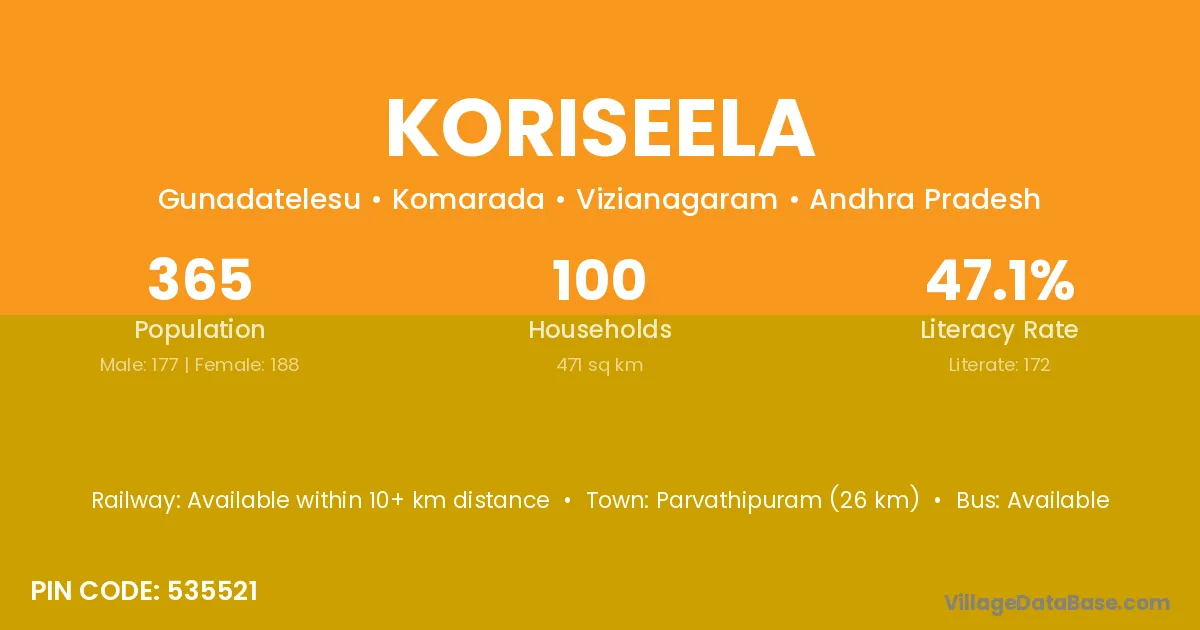 Parvathipuram (26 km) is the nearest town to Koriseela village for major economic activities and is located approximately 26 km away.