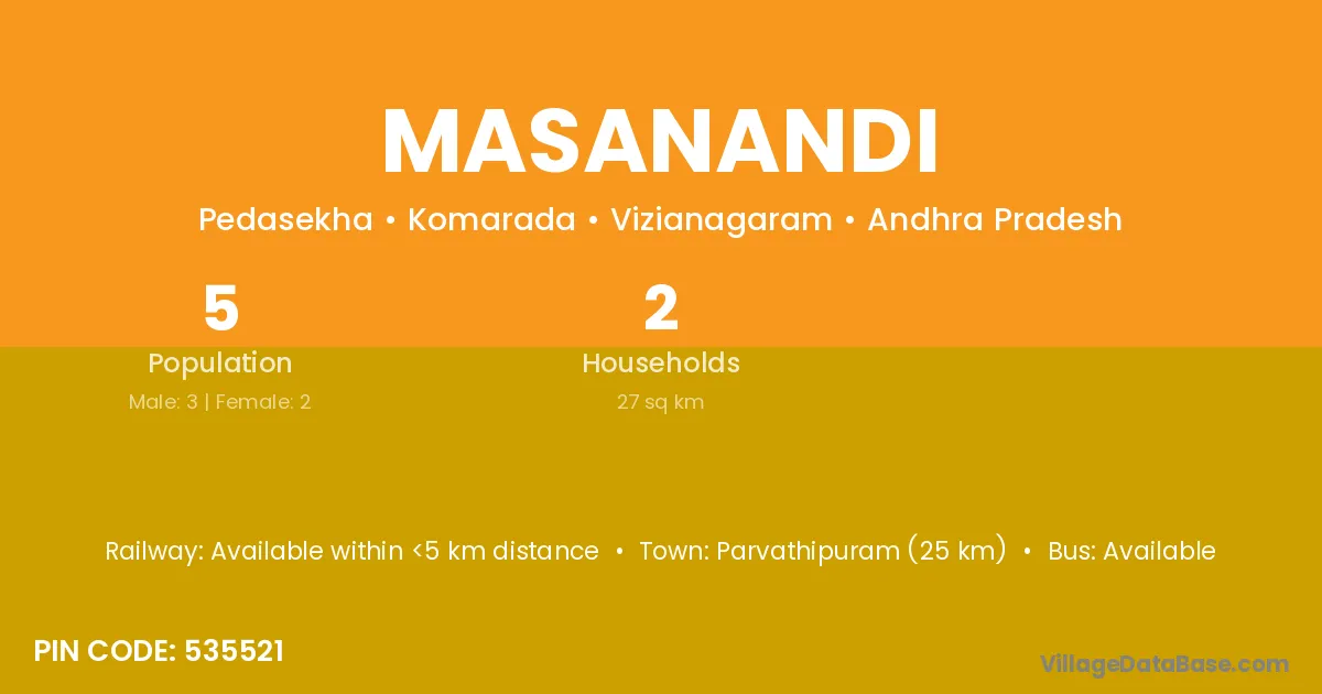 Parvathipuram (25 km) is the nearest town to Masanandi village for major economic activities and is located approximately 25 km away.