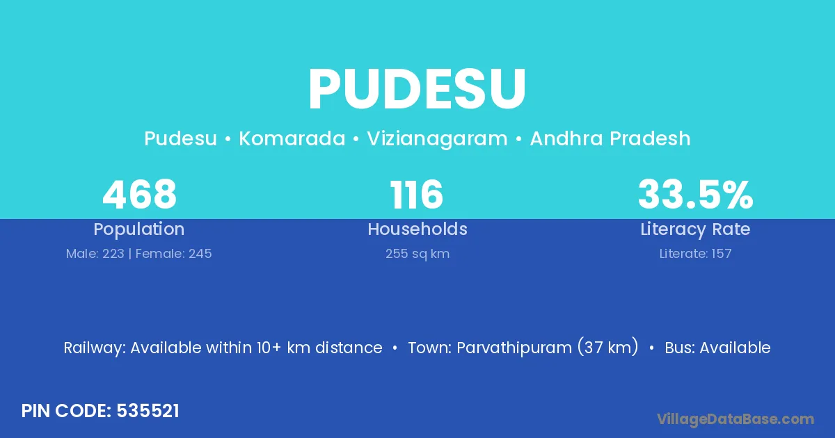 Parvathipuram (37 km) is the nearest town to Pudesu village for major economic activities and is located approximately 37 km away.