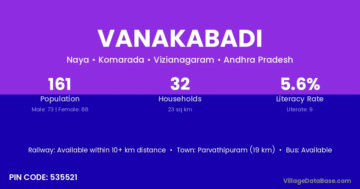 The literacy rate of Vanakabadi village is 5.59%. Male literacy stands at 8.22% and female literacy at 3.41%.