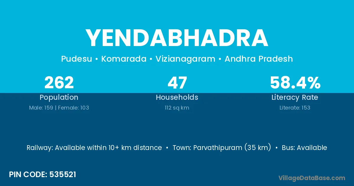 Parvathipuram (35 km) is the nearest town to Yendabhadra village for major economic activities and is located approximately 35 km away.