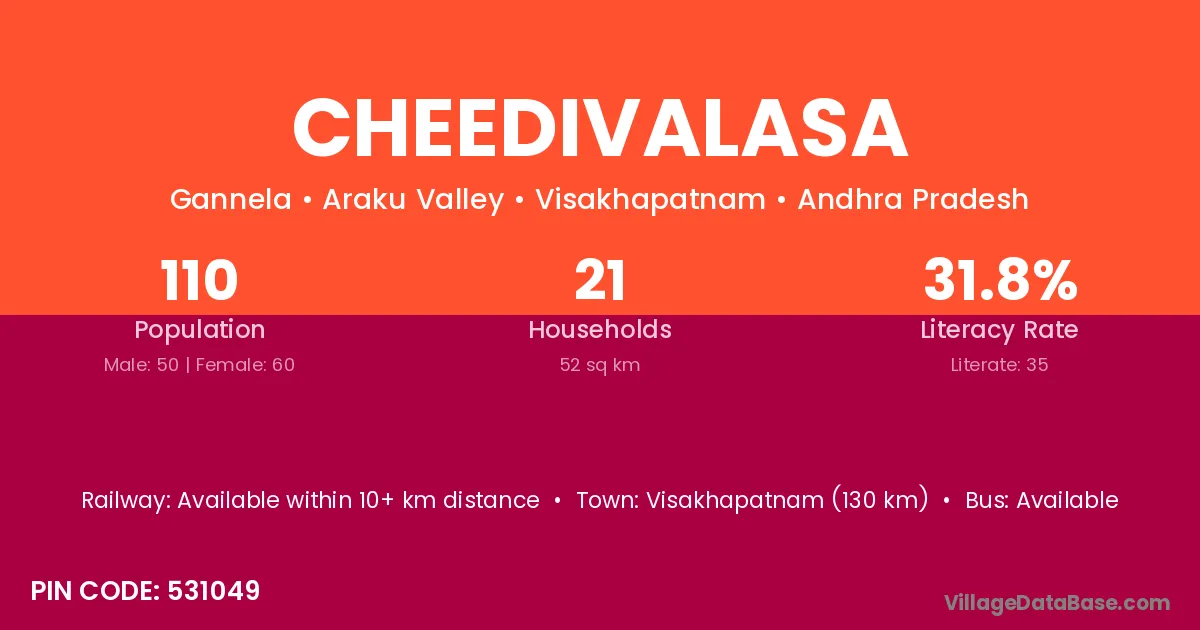 The literacy rate of Cheedivalasa village is 53.67%. Male literacy stands at 66.22% and female literacy at 41.04%.