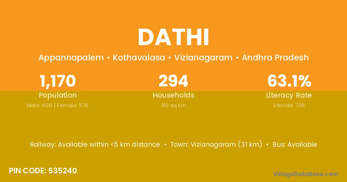 Vizianagaram (31 km) is the nearest town to Dathi village for major economic activities and is located approximately 31 km away.