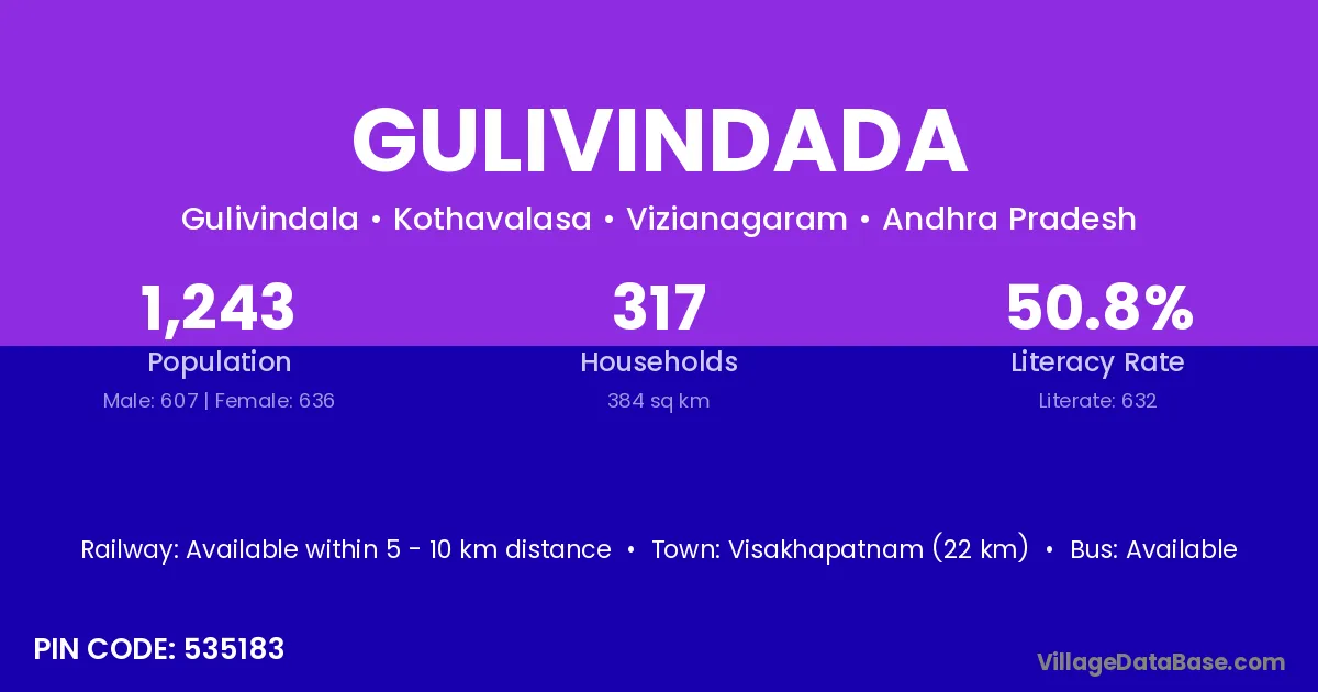 Gulivindada village has a total population of 1,243 people, of which 607 are males and 636 are females.