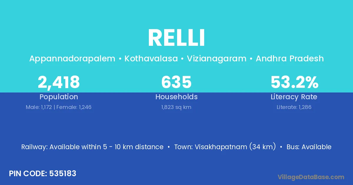 Visakhapatnam (34 km) is the nearest town to Relli village for major economic activities and is located approximately 34 km away.