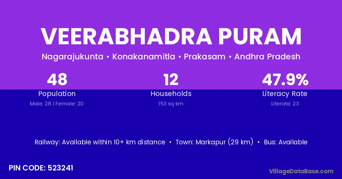 The literacy rate of Veerabhadra Puram village is 57.04%. Male literacy stands at 62.76% and female literacy at 52.27%.