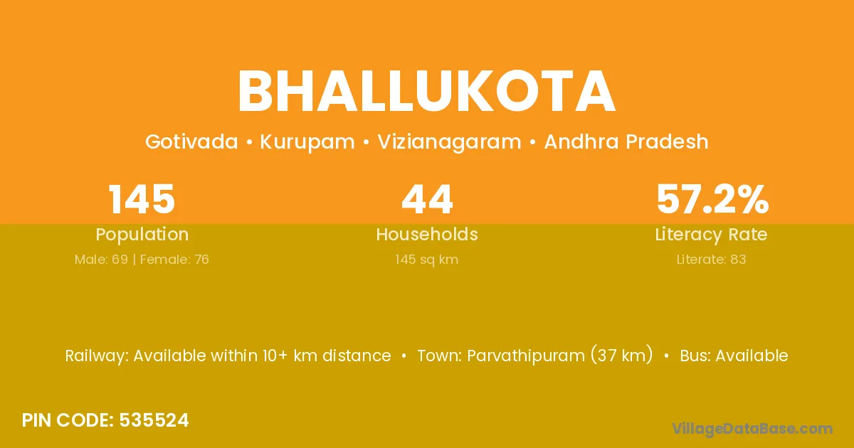 Parvathipuram (37 km) is the nearest town to Bhallukota village for major economic activities and is located approximately 37 km away.