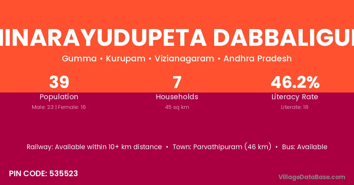 Chinarayudupeta Dabbaliguda village has a total population of 39 people, of which 23 are males and 16 are females.