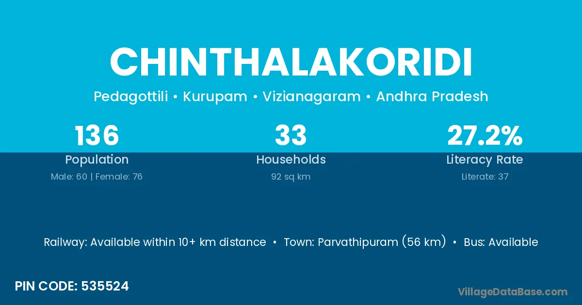Chinthalakoridi village has a total population of 136 people, of which 60 are males and 76 are females.