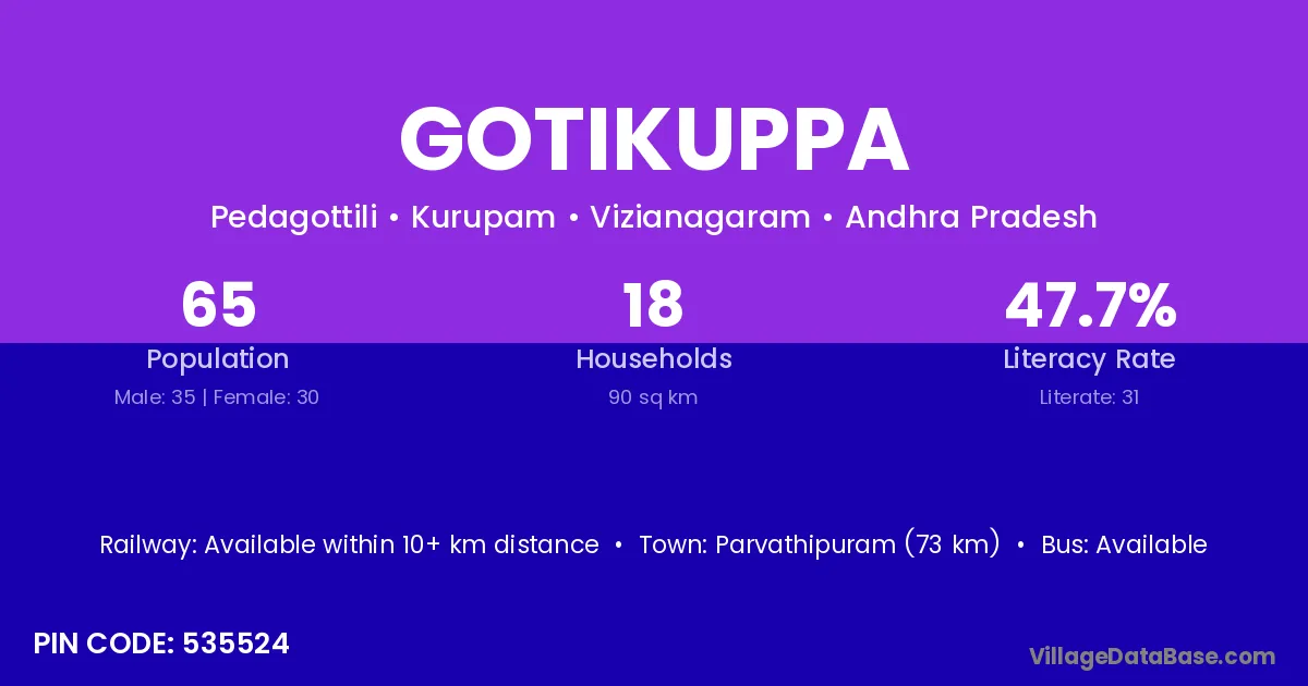 Gotikuppa village has a total population of 65 people, of which 35 are males and 30 are females.