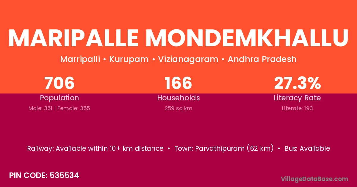 Maripalle Mondemkhallu village has a total population of 706 people, of which 351 are males and 355 are females.