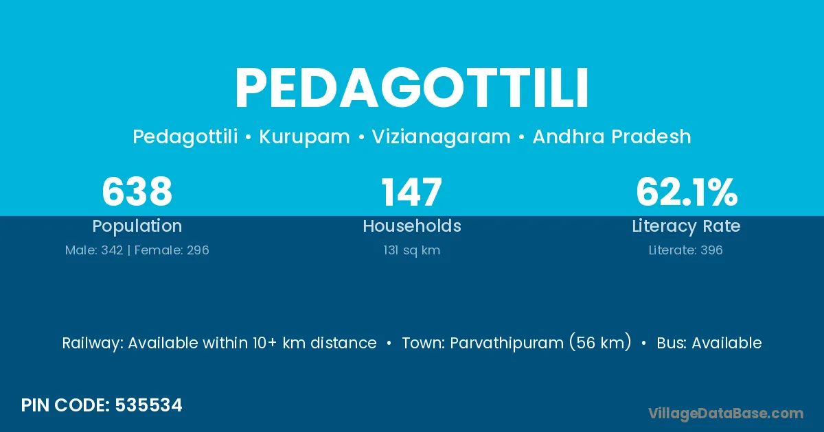 Parvathipuram (56 km) is the nearest town to Pedagottili village for major economic activities and is located approximately 56 km away.
