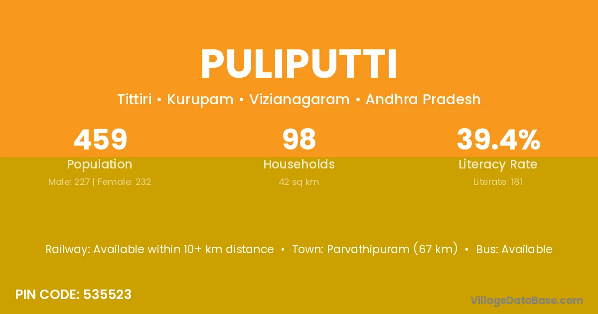 Puliputti village has a total population of 459 people, of which 227 are males and 232 are females.