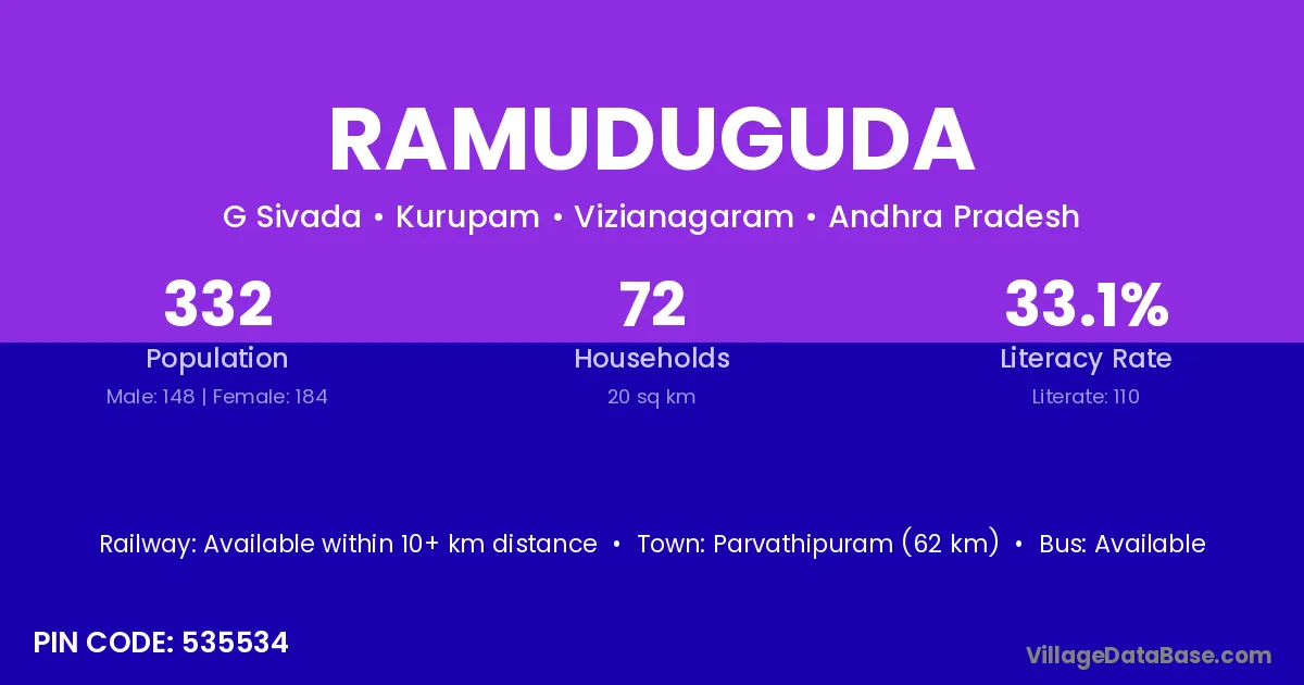 Parvathipuram (62 km) is the nearest town to Ramuduguda village for major economic activities and is located approximately 62 km away.