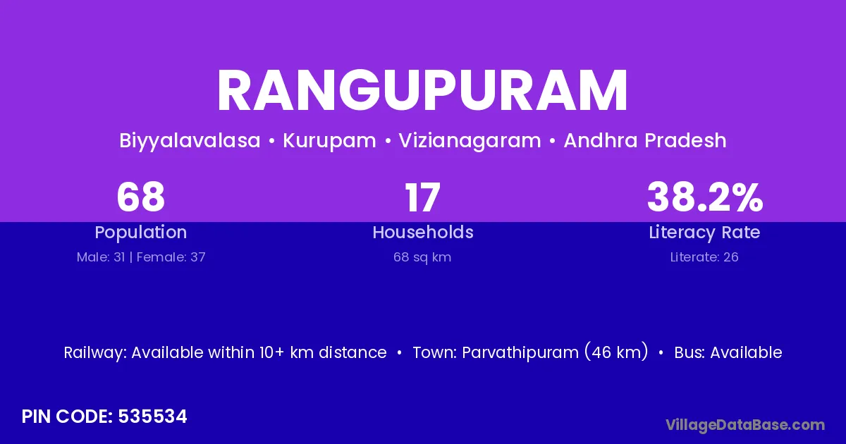 Rangupuram village has a total population of 68 people, of which 31 are males and 37 are females.