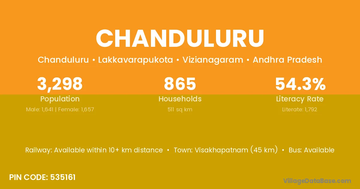 Chanduluru village has a total population of 3,298 people, of which 1,641 are males and 1,657 are females.