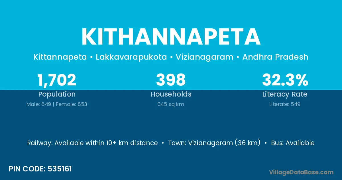Kithannapeta village has a total population of 1,702 people, of which 849 are males and 853 are females.