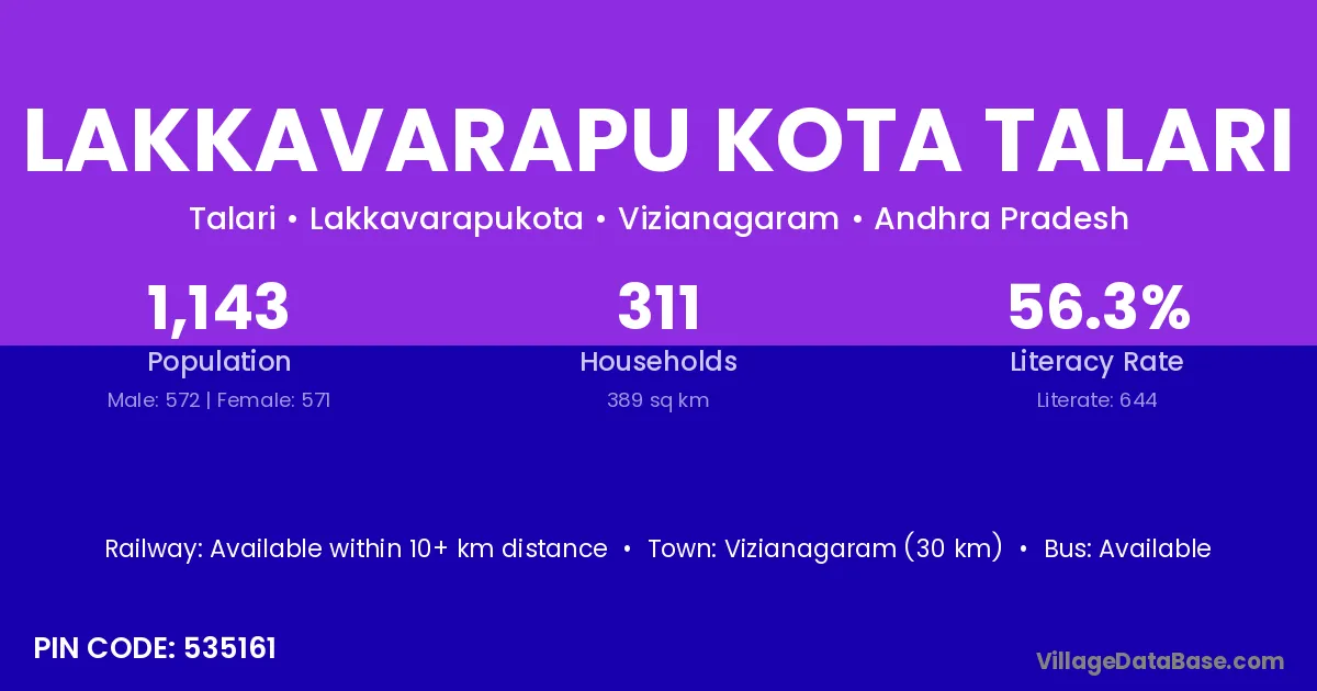 Lakkavarapu Kota Talari village has a total population of 1,143 people, of which 572 are males and 571 are females.