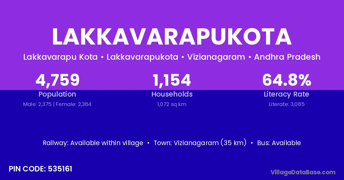Lakkavarapukota village has a total population of 4,759 people, of which 2,375 are males and 2,384 are females.