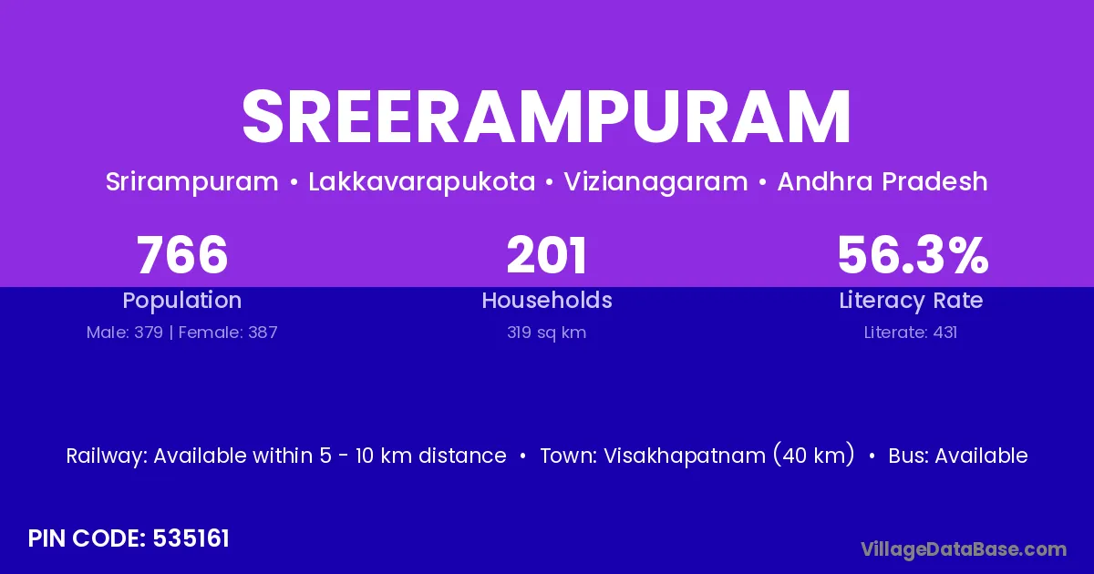 Sreerampuram village has a total population of 766 people, of which 379 are males and 387 are females.