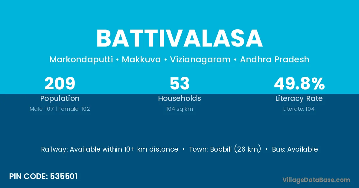 Battivalasa village has a total population of 209 people, of which 107 are males and 102 are females.