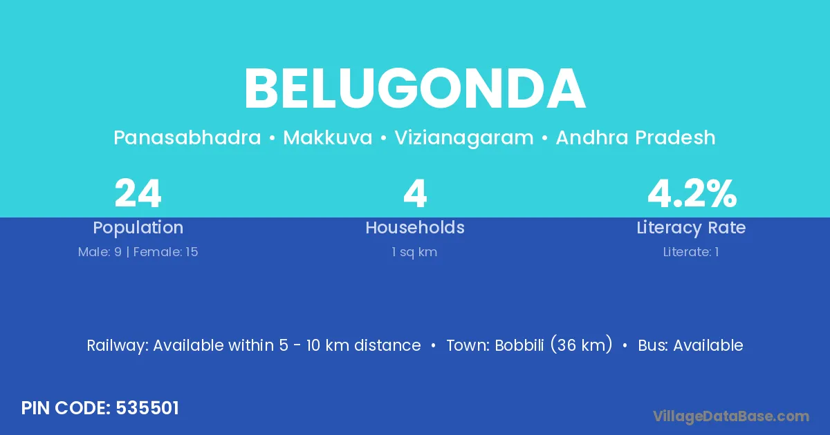 Bobbili (36 km) is the nearest town to Belugonda village for major economic activities and is located approximately 36 km away.