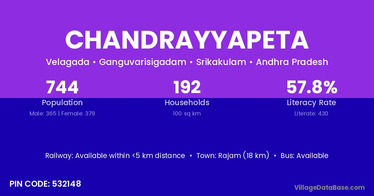 Bobbili (23 km) is the nearest town to Chandrayyapeta village for major economic activities and is located approximately 23 km away.
