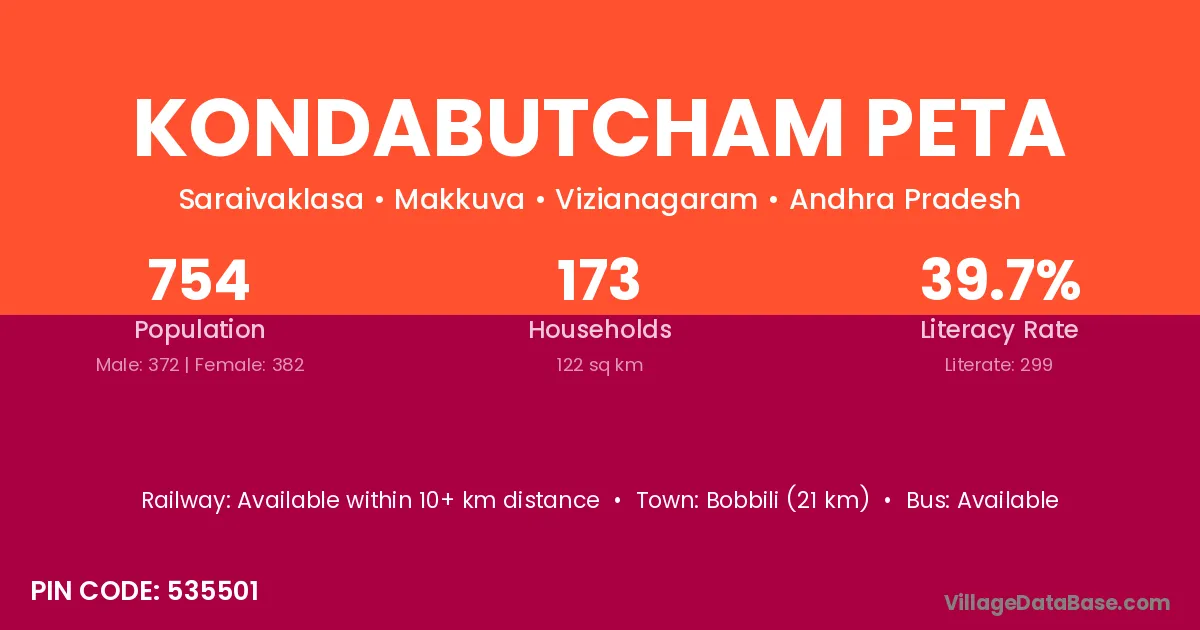 Bobbili (21 km) is the nearest town to Kondabutcham Peta village for major economic activities and is located approximately 21 km away.