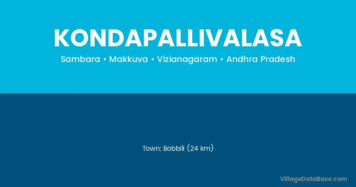 Bobbili (24 km) is the nearest town to Kondapallivalasa village for major economic activities and is located approximately 24 km away.