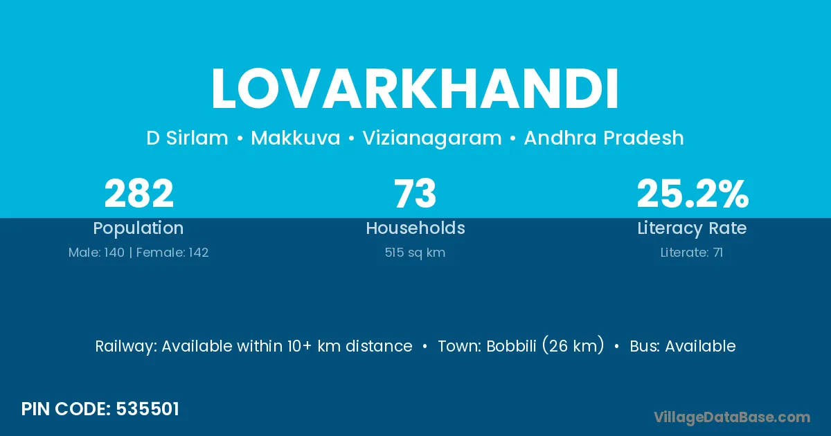 Bobbili (26 km) is the nearest town to Lovarkhandi village for major economic activities and is located approximately 26 km away.