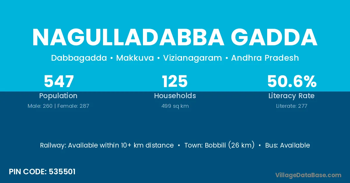 Bobbili (26 km) is the nearest town to Nagulladabba Gadda village for major economic activities and is located approximately 26 km away.