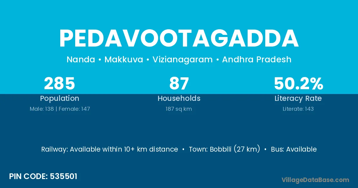 Bobbili (27 km) is the nearest town to Pedavootagadda village for major economic activities and is located approximately 27 km away.