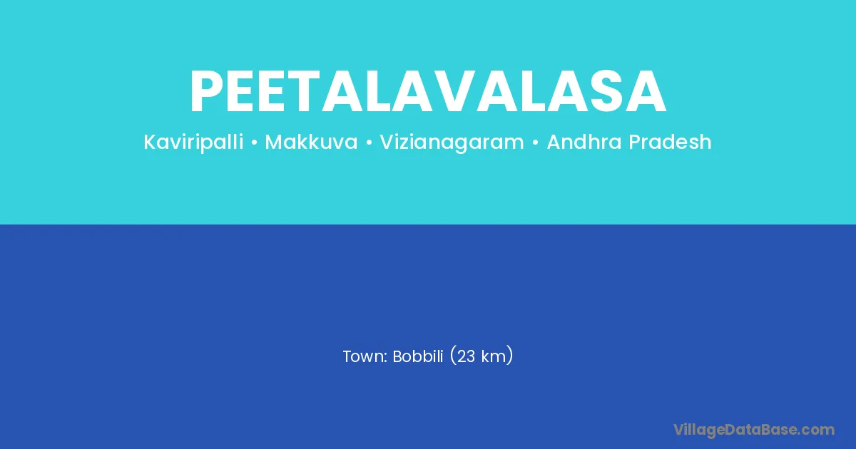 Bobbili (23 km) is the nearest town to Peetalavalasa village for major economic activities and is located approximately 23 km away.