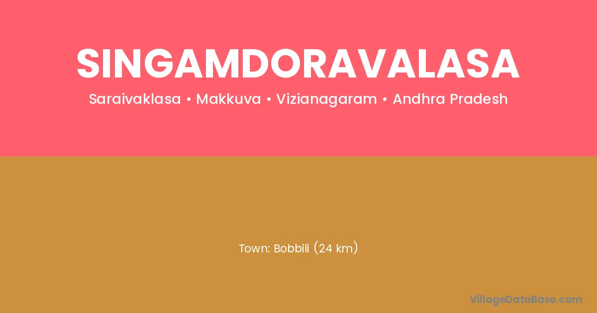 Bobbili (24 km) is the nearest town to Singamdoravalasa village for major economic activities and is located approximately 24 km away.