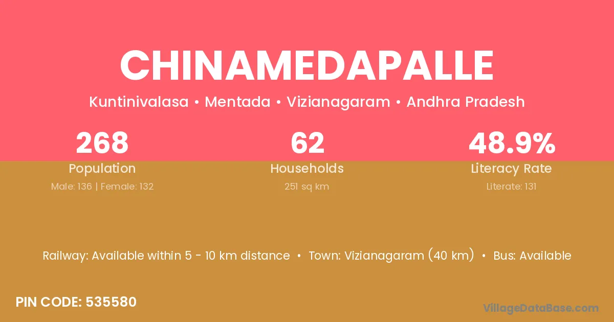 Vizianagaram (40 km) is the nearest town to Chinamedapalle village for major economic activities and is located approximately 40 km away.